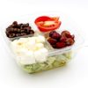Takeaway-salaatti, jossa salaattia, tomaattia, fetaa, oliiveja ja viinirypäleitä. Kastikevaihtoehdot: curry-lime ja rhode island.